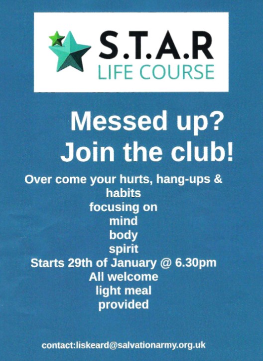 Salvation Army Church 17 Church Street, LiskeardS.T.A.R Life Course Messed up? Join the club! Overcome your hurts, hang-ups and habits, focusing on mind, body and spirit. Starts 29th of January at 6.30pm.All welcome.Light meal provided. Contact: […]