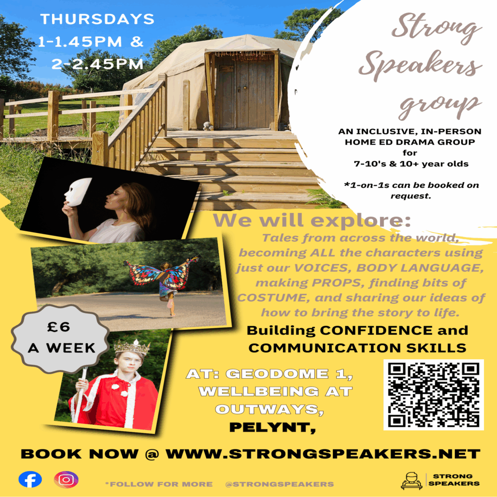 An inclusive, in-person home ed drama group for children aged 7-10 and 10+ (1 on 1 can be booked on request)